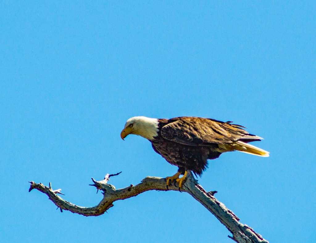 This morning I got up and took my usual hike on the beach, but this time instead of heading south I headed north. As I was walking along listening to and watching the waves I glanced up on the bluff, to my right, and saw a Bald Eagle sitting in a tree. I got as close as I could, took some photos and then moved to another vantage point in hopes of getting closer. After I finished taking photos, I turned to resume my hike and saw a second eagle about 100 yards away. I was able to get closer to the second eagle, but it didn’t stick around long. I took two photos before it flew off.