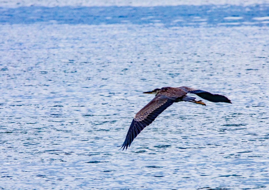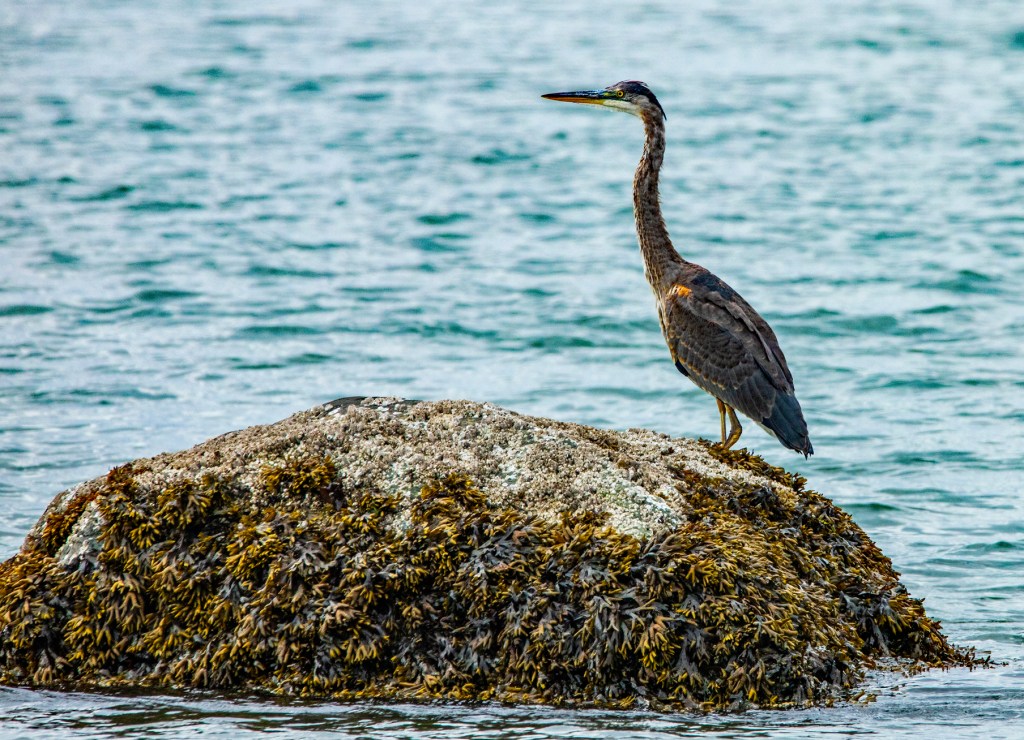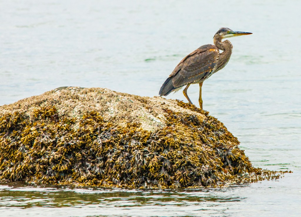 This morning I took a walk along the shoreline during low tide. As I walked I was enjoying watching crabs walking along the sea floor looking for their next meal. I explored the tide pools with their abundant sea life. I watched a couple paddle their kayaks across the quiet bay. Afterwards I took a seat on a fallen tree just to relax and take it all in. While I was sitting, a Great Blue Heron flew over my left shoulder and landed on a small island approximately 100 feet offshore. After about 10 minutes of looking for something to eat and not finding anything, it took off and flew right towards me. It landed approximately 50 feet in front of me. A couple of minutes later it went fishing and I was able to catch the action with my camera.
