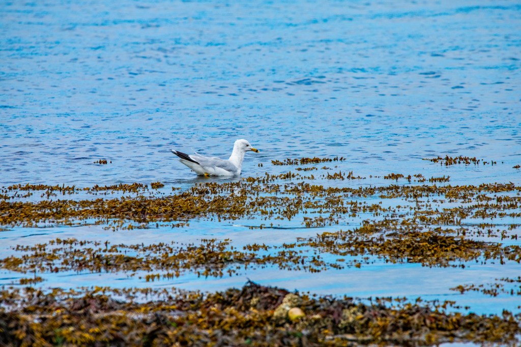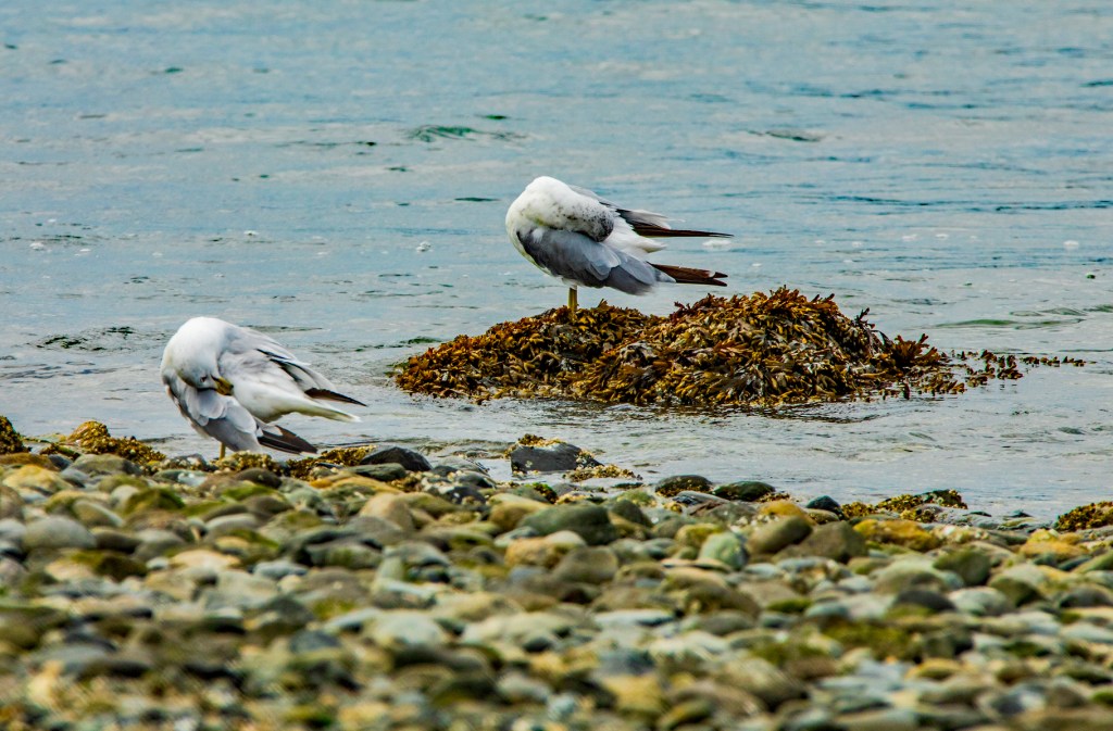 Last night it rained and so as the skies began to clear this morning I wandered down to the water to see if there were any changes. Today the tide was way up so the small island, just off shore was submerged. This made it so the birds that like to inhabit the island had to move onshore. This made it easier for me to photograph them. All except the Great Blue Heron, who kept moving from place to place along the shore. However, I was able to get some good photos of it. Take a look!