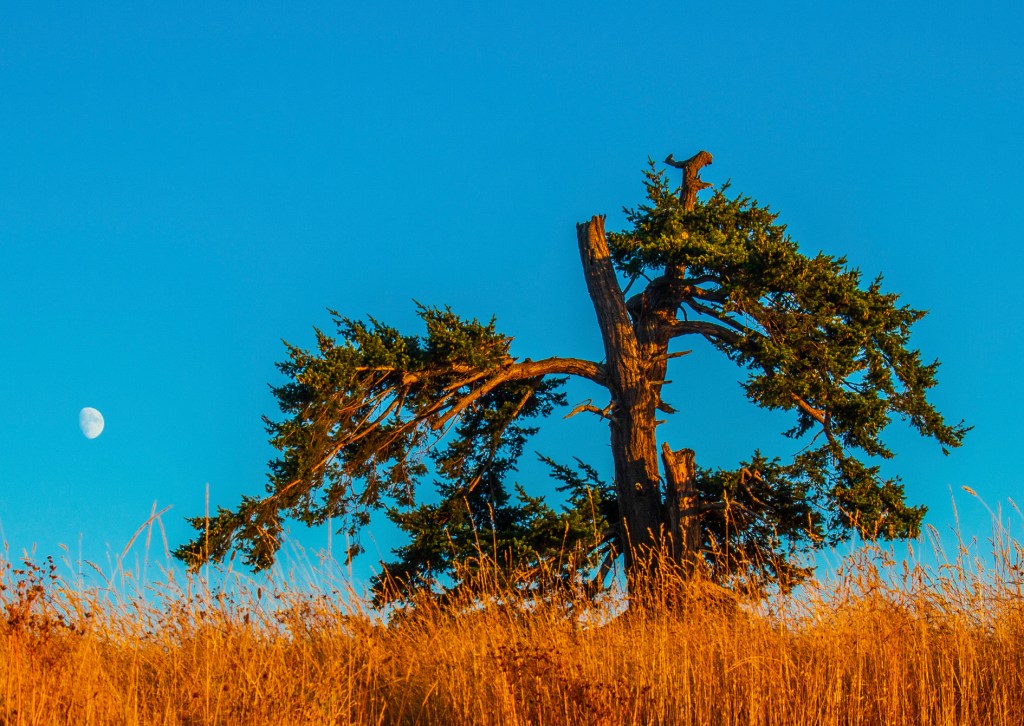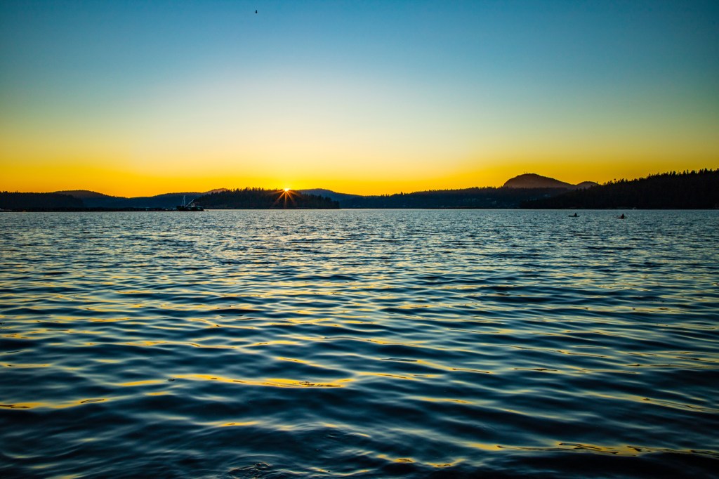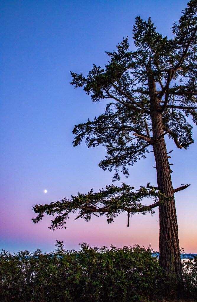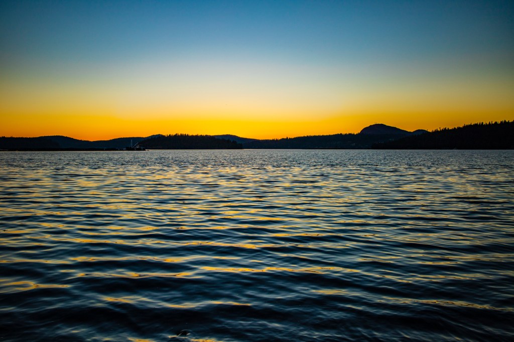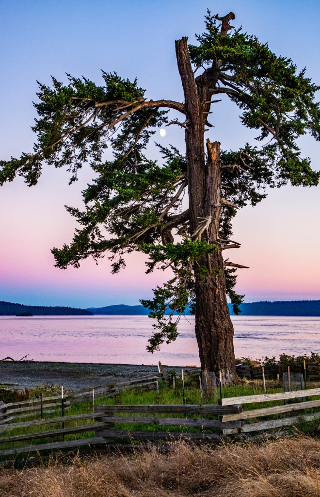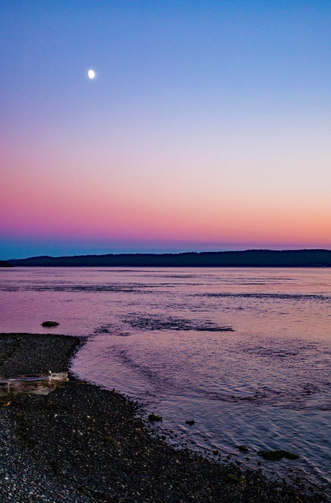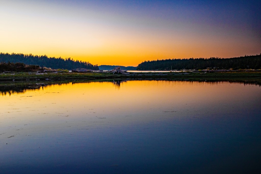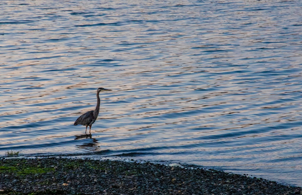 Last evening I hiked down to the shoreline in hopes of catching another colorful sunset. However, last evenings sunset didn’t live up to expectations. I did however have an enjoyable evening with the local wildlife. While I was taking photos of the sunset I noticed just off shore there was a sealion closely watching me. It stayed there for a few minutes and then disappeared. A few minutes later it reappeared, just a little further out in the water. It stayed there until I picked up my camera and headed back to camp. Also while I was taking photos my friend, the Great Blue Heron, flew in front of me and landed off in the distance behind me. Later, as I turned to begin my hike back to camp I noticed it was standing in the water just a few feet to my right. I guess he or she is getting use to me because the first day we arrived at La Conner I chased this bird up and down the shoreline trying to get a photo.