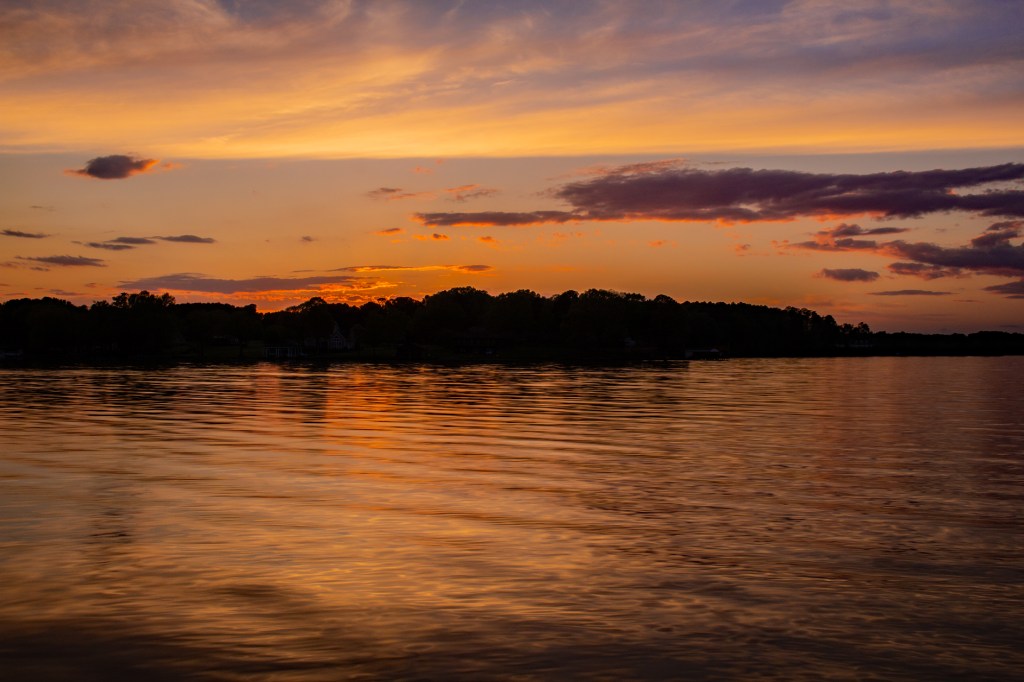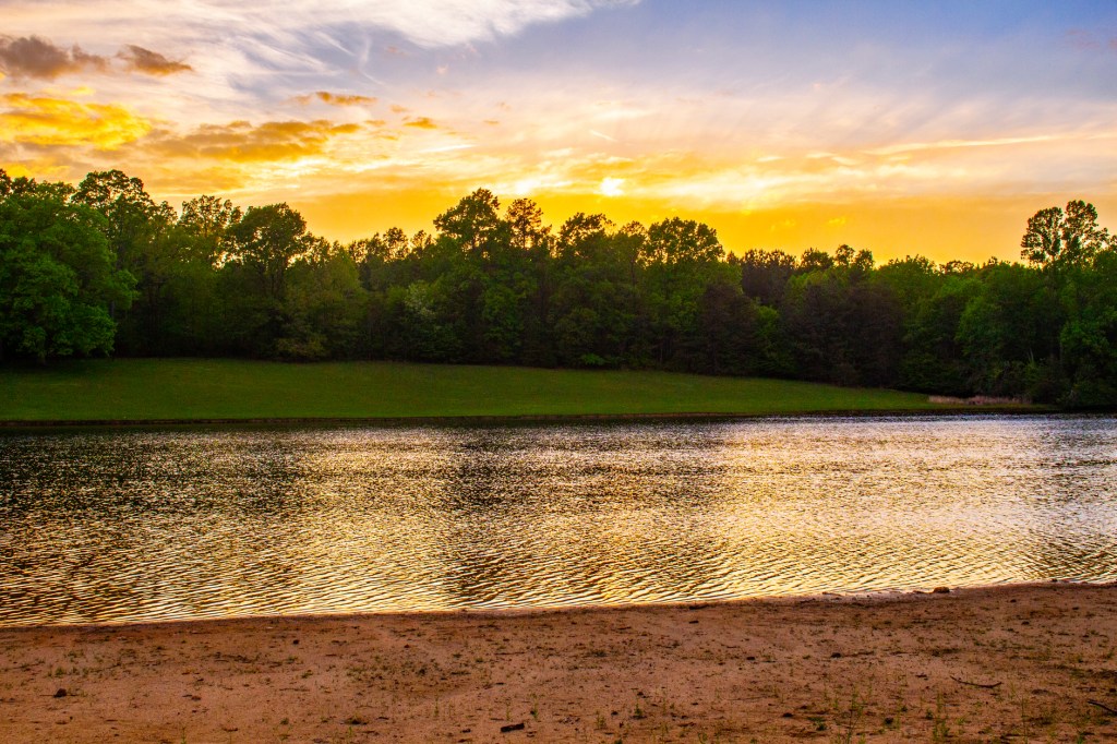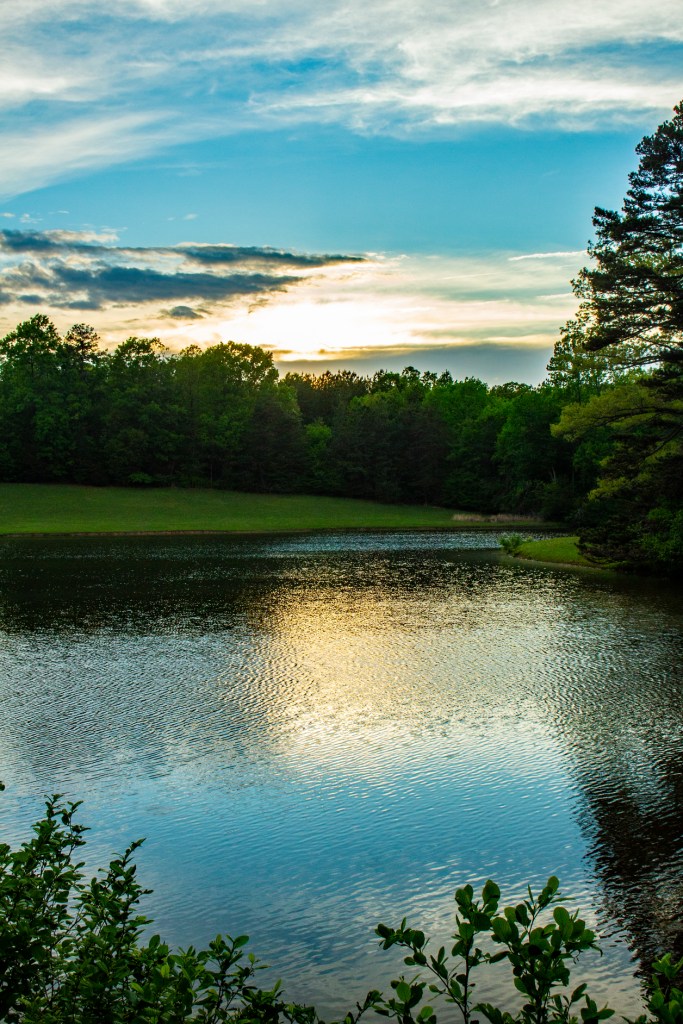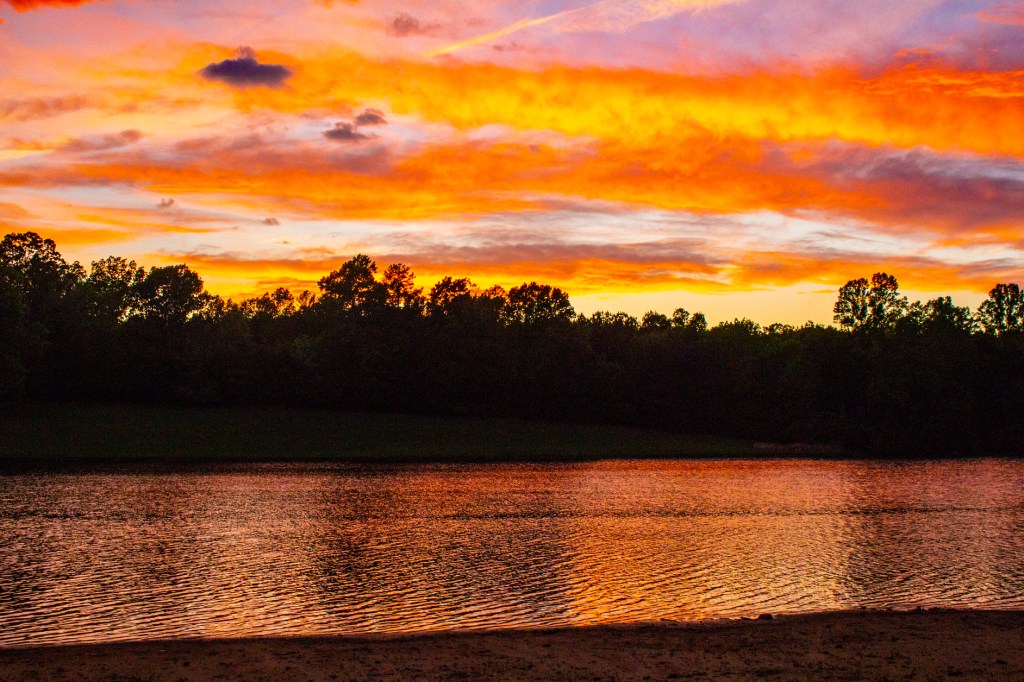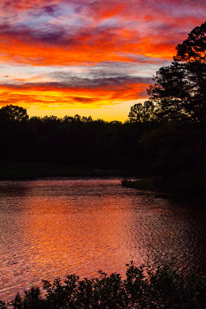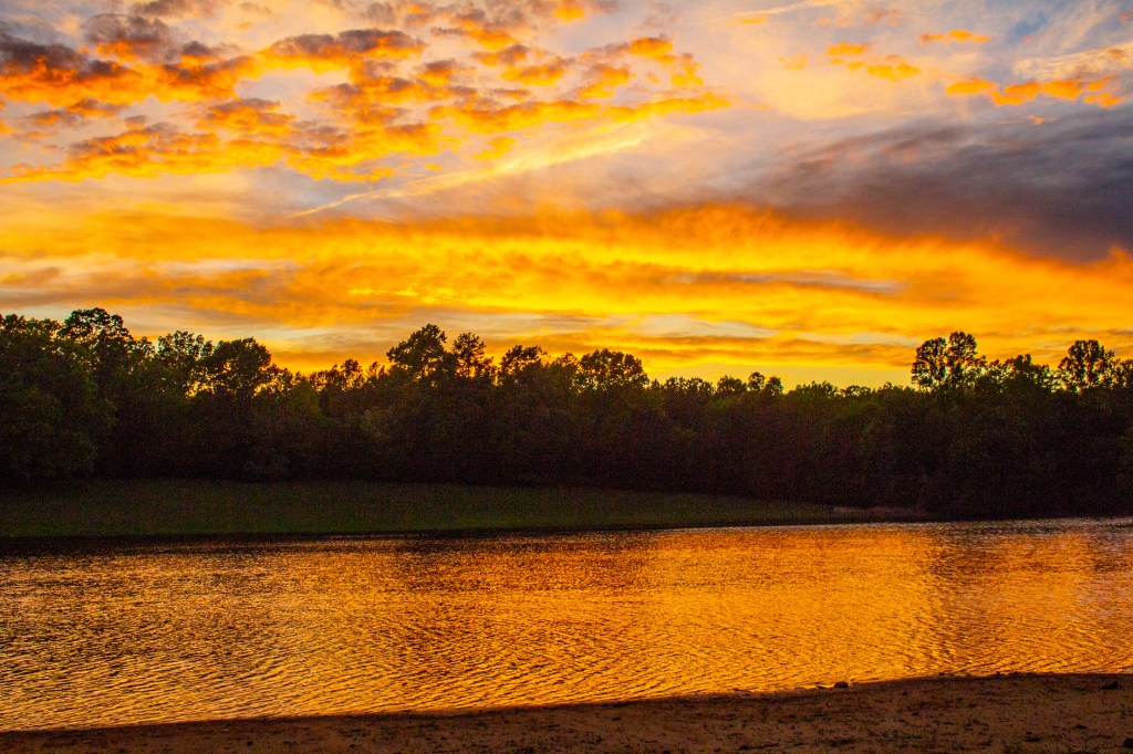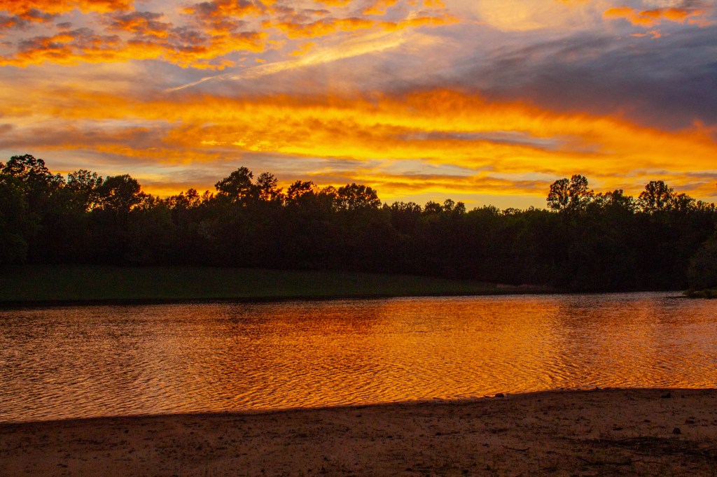 Over the past few days Barbara and I have traveled north from Brunswick, Georgia to Lynchburg, Virginia to the Lynchburg Thousand Trails RV park. If I had to rate this place on first impressions, I’d give it an F. When we arrived yesterday it was raining and the roads in this park are terrible. This place is covered with red clay and now it is all over our truck and trailer. I just had both washed a week ago, but you couldn’t tell it by looking at them now. In a couple of places I had to put the truck into 4WD just to keep from getting stuck in the mud. However, last evening after the storm passed and things began to dry out, I walked down to the lake and watched the sun go down. I enjoyed an awesome sunset. Take a look!