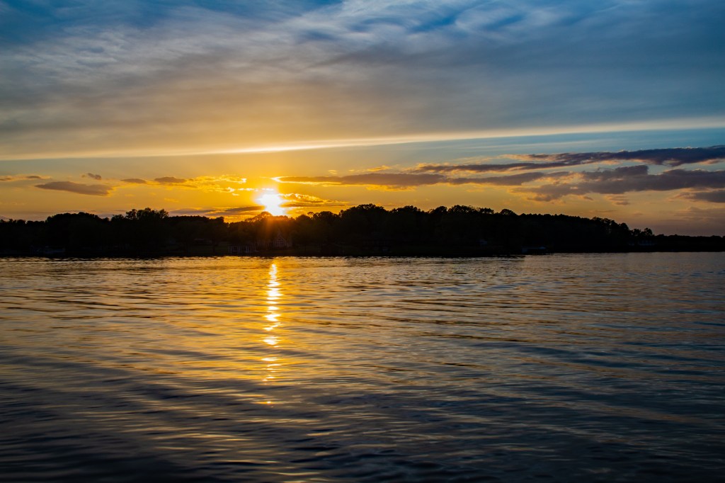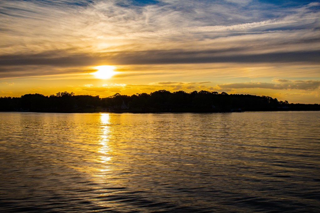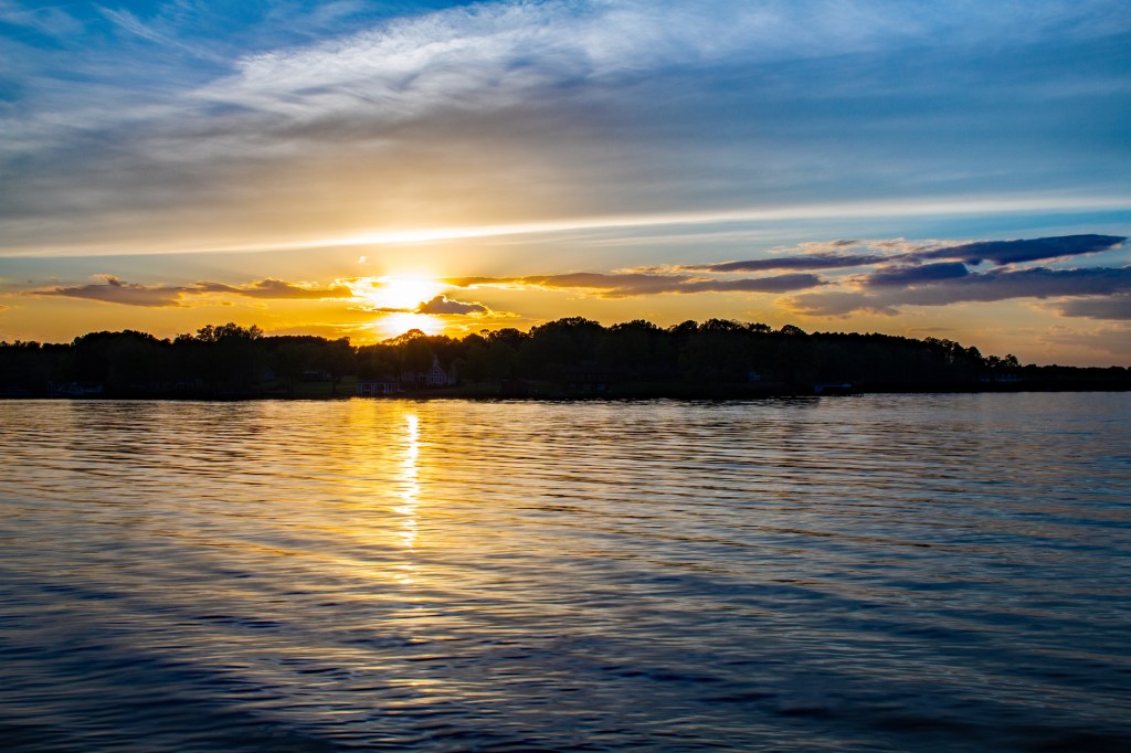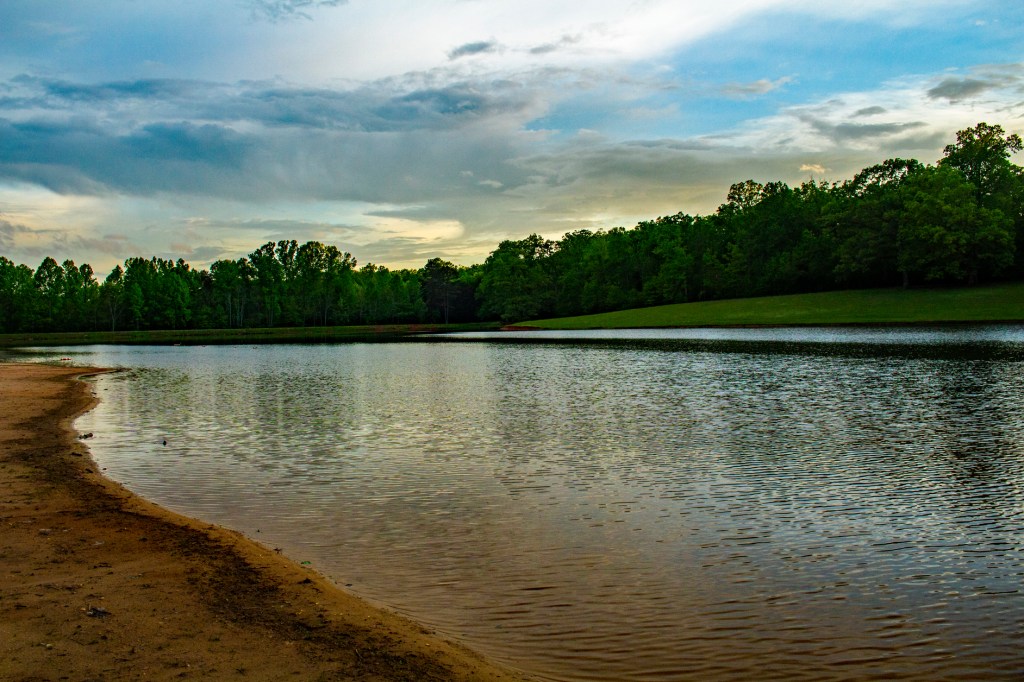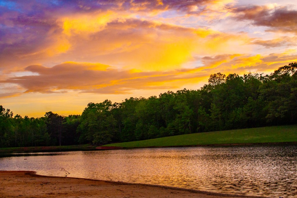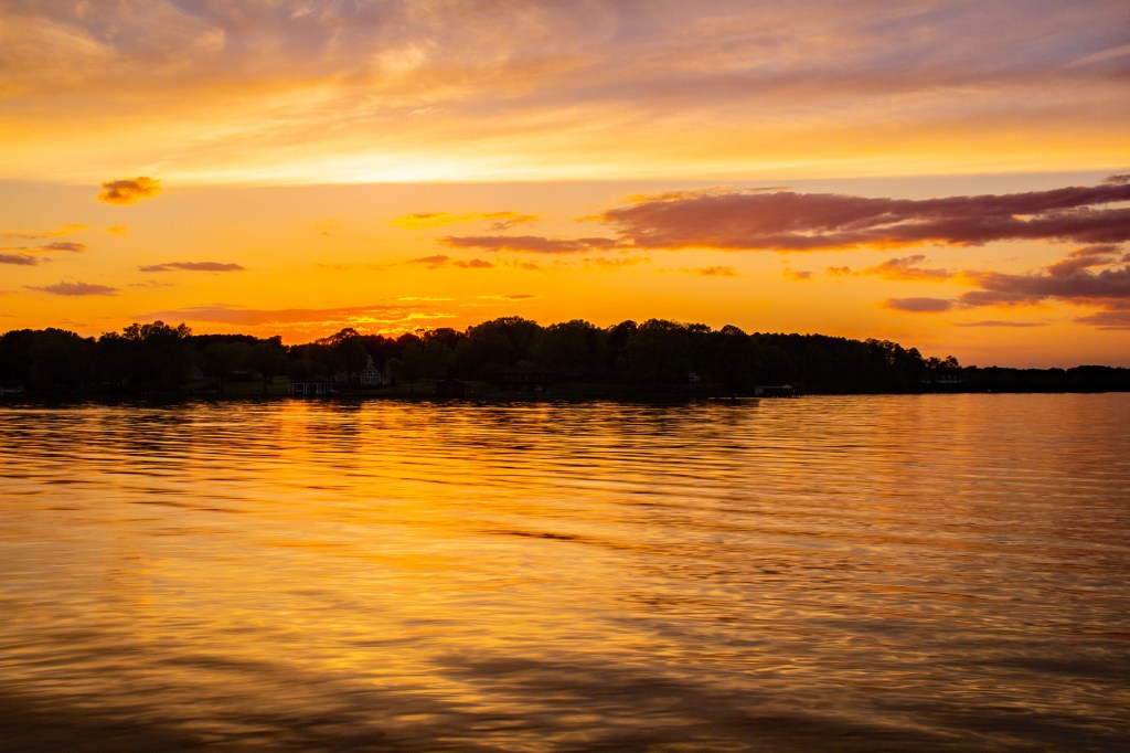Over the past few days Barbara and I have traveled north from Brunswick, Georgia to Lynchburg, Virginia to the Lynchburg Thousand Trails RV park. If I had to rate this place on first impressions, I’d give it an F. When we arrived yesterday it was raining and the roads in this park are terrible. This place is covered with red clay and now it is all over our truck and trailer. I just had both washed a week ago, but you couldn’t tell it by looking at them now. In a couple of places I had to put the truck into 4WD just to keep from getting stuck in the mud. However, last evening after the storm passed and things began to dry out, I walked down to the lake and watched the sun go down. I enjoyed an awesome sunset. Take a look!