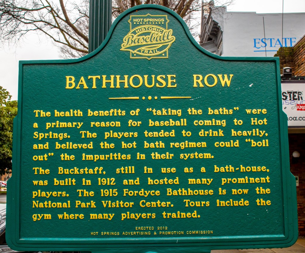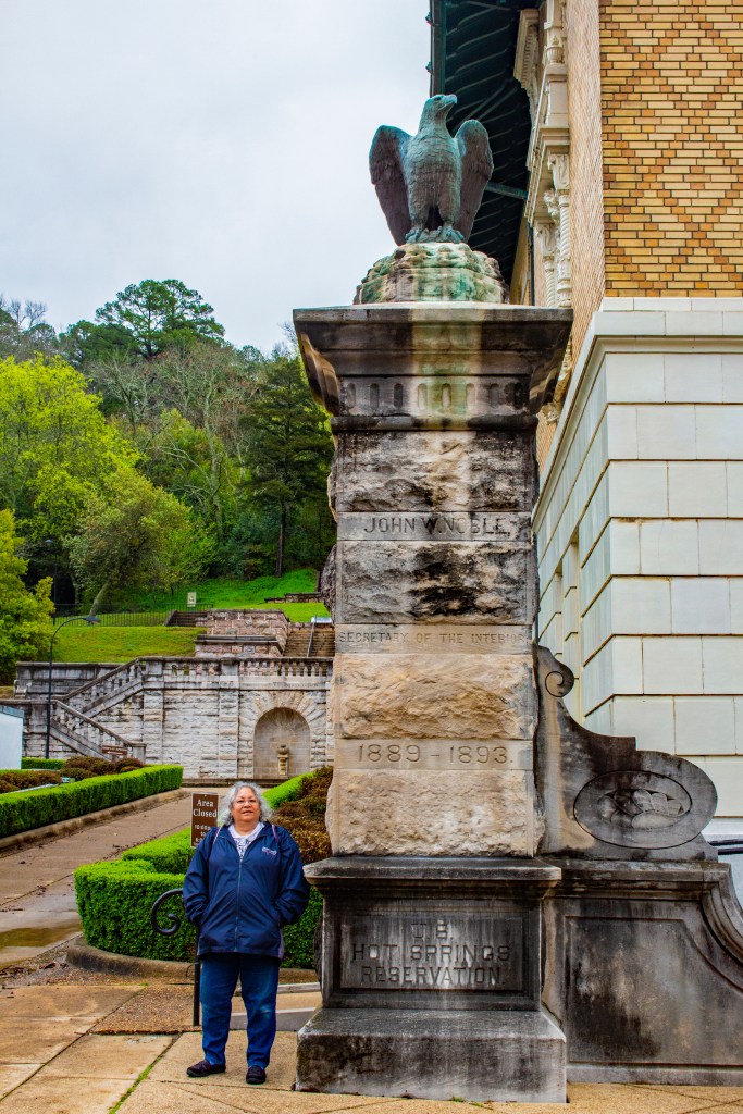 Last week Barbara and I traveled from New Orleans to the town and national park of Hot Springs in Arkansas. As far as national parks go this isn’t one of the better ones. However we enjoyed our visit. At this location rain water and snow melt percolates down through the cracks in the crustal rock, is heated from below and comes back to the surface as hot springs of almost pure water. This trip takes approximately 4,400 years to complete. Each day nearly 700,000 gallons of 143 degree water comes to the surface in 27 springs located in the area. This water is so pure that it is potable straight from the ground. There are two springs in town where you can fill your own bottles for free.